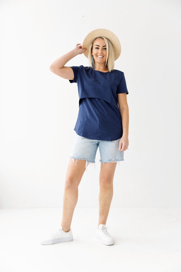 The navy classic breastfeeding tee is a simple and classic staple that will see you through your breastfeeding journey. It is made of 95% cotton and 5% spandex. It has discrete flap access at the front for feeding.